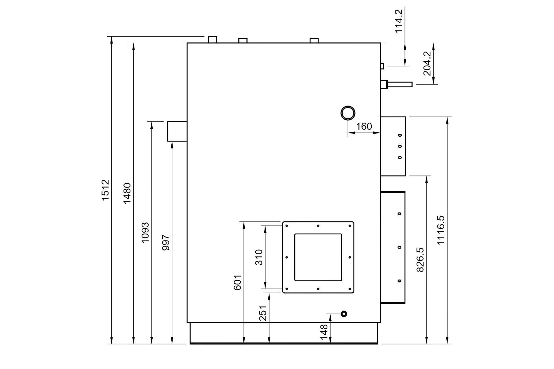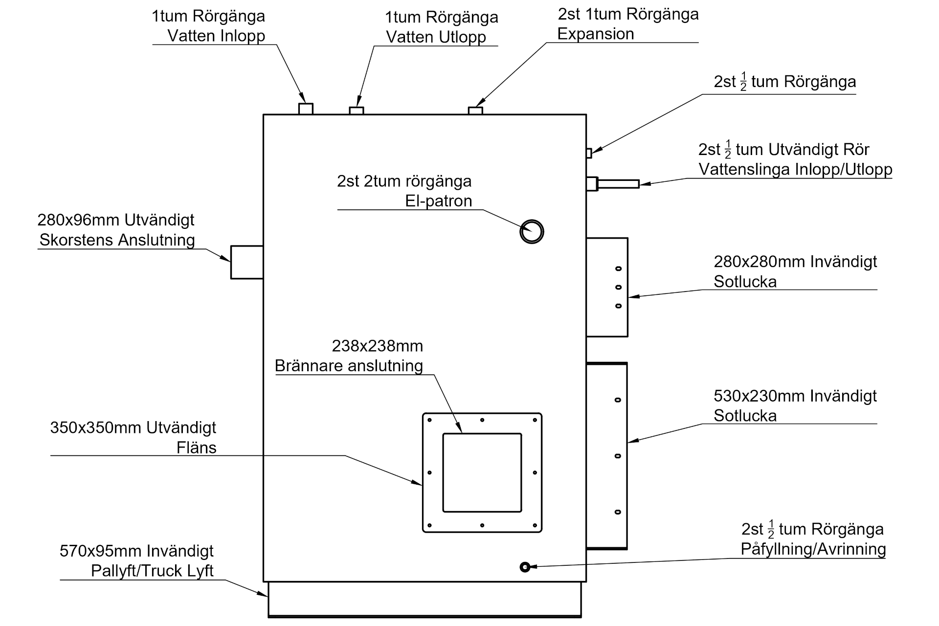 Pannan har anslutningshål för brännare på både höger och vänster sida, för att flexibelt passa till de flesta pannrum. Asklucka för eldstaden och sotlucka för konvektionsdelen sitter i pannans front. Detta gör att uraskning, sotning och inspektion är enkelt att utföra. Dessutom är askluckans storlek extra tilltagen för att göra underhåll och inspektion ännu lättare och smidigare. Pannan är lämplig att använda ihop med flera olika pellets- och flisbrännare, tex Sonnys Multistoker med flera.